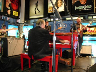 in front of him and said that this album had more members of the Rock and Roll Hall of Fame than any other album in history! He then introduced Kid and JLL. Jerry Lee handled the opening, half-spoken, verse of Honky Tonk Women looking sharp and alert. One had the sense that once he was warmed up his voice would be in fine form. Kid handled the next verse. It looked like the usual members of the band were all there along with Jimmy Rip. There were female back-up singers and the band was joining in too. After Kid's verse JLL did a very good piano run and it was starting to rock. JLL smiled plenty for the cameras. They went into the refrain - gimme, gimmme, gimme, etc. and it was over. JLL all smiles; good audience reaction; Leno rushed over to shake hands; cut to commercial; done.
